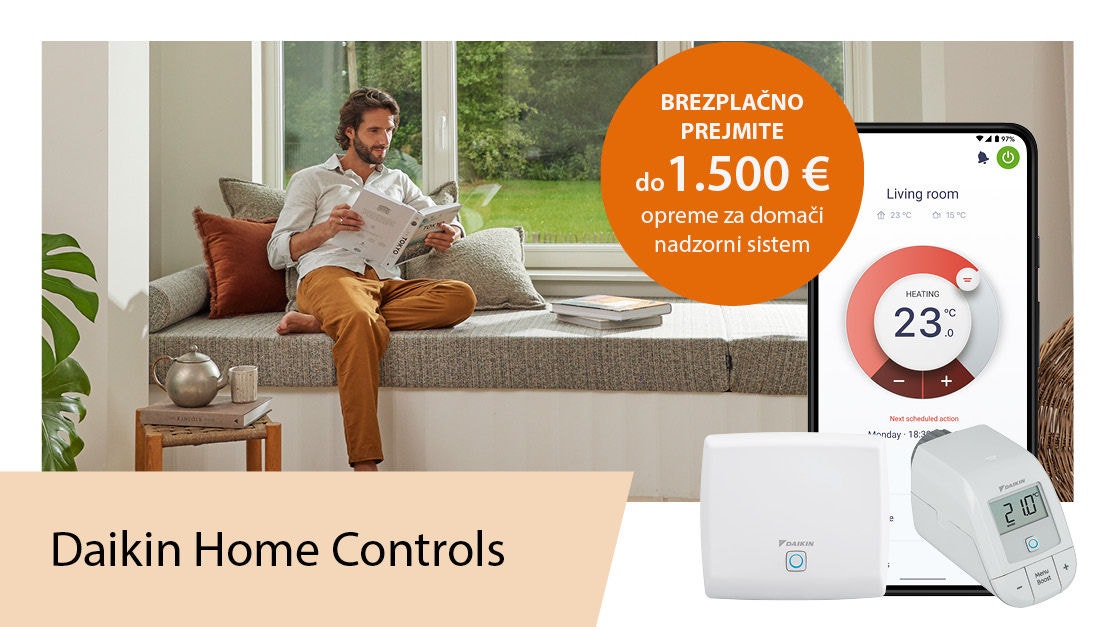 Ob izbiri toplotne črpalke Daikin Altherma 3H HT, 3H MT ali 3 R MT prejmete sistem Daikin Home Controls v vrednosti do 1.500 € popolnoma brezplačno. Brezplačni paket vključuje do: 1 × dostopno točko, 4 × sobna tipala temperature, 10 × termostatskih radiatorskih ventilov, 1 × IO enoto za povezavo s sistemom Daikin Altherma.