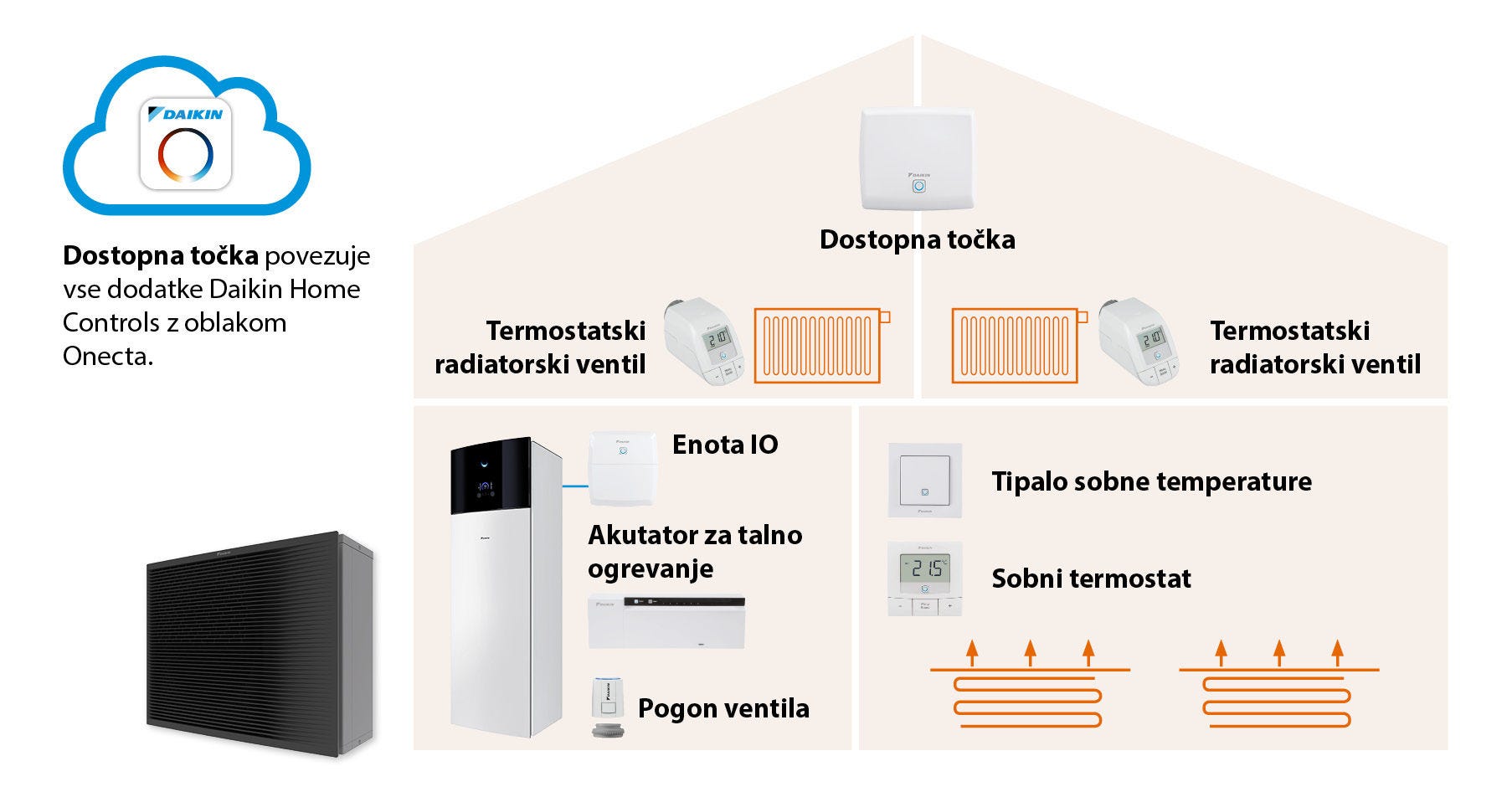 Na voljo so žične in brezžične pametne naprave, ki, na uporabnikom prijazen način, omogočajo najvišji nivo prilagodljivosti ter zagotavljanja energijske učinkovitosti. Vse naprave Daikin Home Controls se povezujejo v ekosistem Daikin Onecta in tako omogočajo enostavno in natančno upravljanje z ogrevanjem posameznih prostorov.